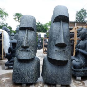 Fabricada en piedra reconstituida con un acabado negro envejecido, esta estatua combina durabilidad y atractivo estético.